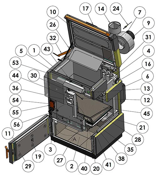 04 200 BC Combustione   FASE 4 - Dopo 24 ore e oltre: dal primo caricamento del combustibile, e nel caso non sia stata effettuata un'ulteriore carica, nella camera di combustione non ci saranno più tizzoni ardenti, ma saranno solo più presenti i residui di combustibile sotto forma di carbone di legna. Per riavviare la combustione sarà sufficiente attivare l‘aspiratore ed accendere tale strato di carbonella con un pezzo di carta.
