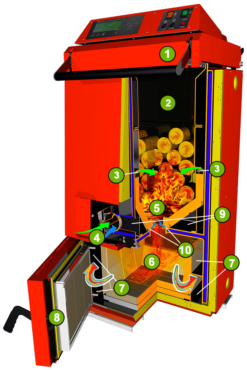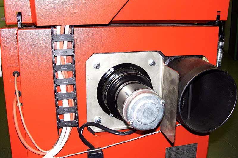 Sistema aria comburente: la combustione viene alimentata con aria presa dall'esterno impiegando un aspiratore posteriore che genera una depressione interna alla caldaia che a sua volta induce altra aria ad entrare dalle prese d’aria frontali. Queste ultime sono dotate di serranda a chiusura naturale, funzionanti sul sitema del regolatore di tiraggio, cosa che riduce al minimo l‘afflusso incontrollato di aria comburente dovuta al tiraggio naturale della canna fumaria anche a ventilatore spento.