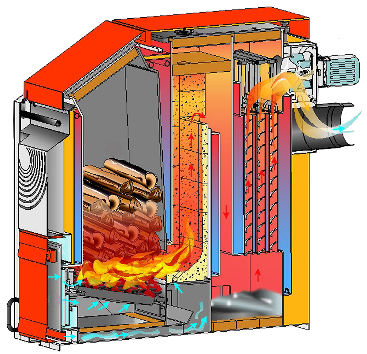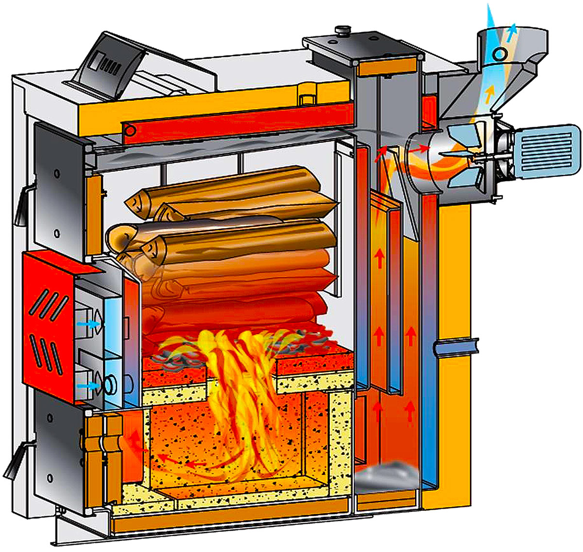 In entrambi i casi le fiamme non potendosi sviluppare verso l’alto non coinvolgono nel ciclo di combustione tutto il carico di legna, ma solo la parte inferiore. I gas che si generano a seguito della pirolisi sono spinti (caldaia soffiata) o aspirati (caldaia aspirata), attraverso una feritoia posta alla base del vano di carico, nella parte sottostante dove è posta la camera di combustione, qui i gas vengono miscelati con l’aria comburente secondaria e si incendiano sviluppando grandi quantità di calore con temperature elevatissime che possono raggiungere i 1000÷1100°C. Data l’elevata temperatura raggiunta nella fase di combustione la camera di combustione deve necessariamente essere in materiale refrattario ad alta resistenza termo meccanica. Una camera di combustione in metallo, anche se in acciaio refrattario, subirebbe delle deformazioni permanenti e le lamiere e le saldature sarebbero sottoposte a tensioni tali che porterebbero in breve tempo a gravi cedimenti strutturali.