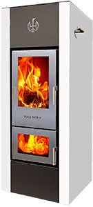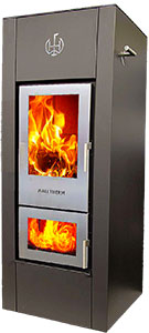 La novità di questa stufa risiede nella collaudata gassificazione a fiamma inversa senza l'utilizzo di dispositivi au - siliari elettrici o elettronici da utilizzare per fare funzionare il sistema e quindi senza bisogno di supportare il sistema con energie secondarie derivate da combustibili tradizionali, il che rende il sistema altamente affidabile e con ridotti rischi di fermata dell’impianto dovuti a usure o rotture. Progettata per funzionare a tiraggio naturale e con gassificazione a fiamma inversa come combustibile utilizza ciocchi di legna o bricchetti di legna vergine pressata da 33cm con un’umidità max del 20% e richiede di essere allacciata TASSATIVAMENTE ad una canna fumaria che abbia un'altezza utile di circa 6m e/o abbia una depressione di 13÷20 Pa.